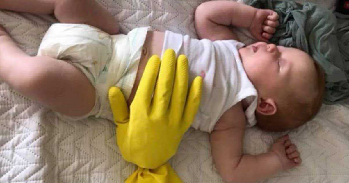Melissa packed a rubber glove with some sand and put it on her one-month-old daughter’s tummy. This imitated the feeling that Melissa’s hand was there, which comforted her baby and allowed her to sneak off softly.